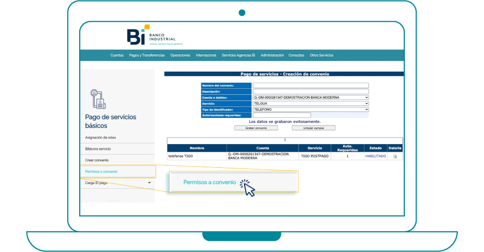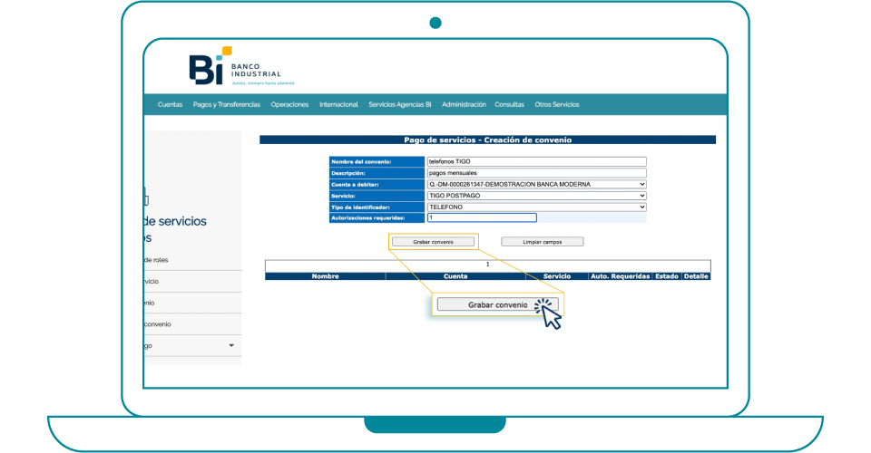 3. Ingresa la información de tu convenio, elige el servicio que deseas pagar y haz clic en Grabar convenio