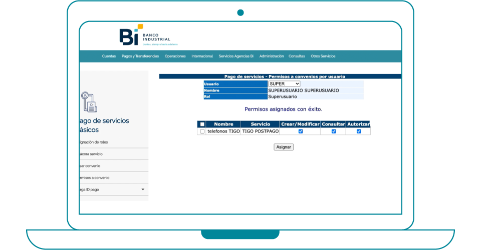5. Selecciona el usuario en la lista, marca la casilla del convenio y asignale los permisos que deseas.
