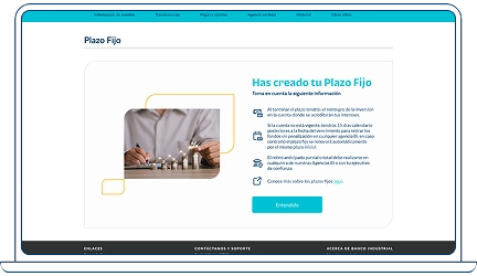 Aprovecha la oportunidad de invertir de manera segura con Banco Industrial. Abre un Plazo fijo con una tasa competitiva y la tranquilidad de estar respaldado por una entidad confiable. Es fácil, rápido y ajustable a tus necesidades.
