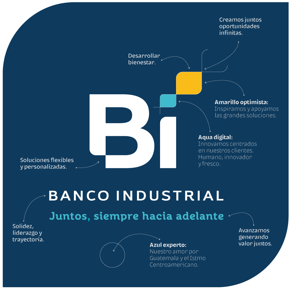 En nuestra nueva paleta de colores destaca el azul sólido, que enfatiza el carácter del banco y los demás atributos de confianza y seguridad que lo determinan; el aqua digital con la fluida asimilación de la tecnología que se hace en Banco Industrial El Salvador para impulsar el desarrollo. Los tonos amarillos exaltan la frescura y el optimismo y la proximidad real a través de la experiencia Bi. En tanto, el blanco transparenta la gestión de esta sólida institución financiera.